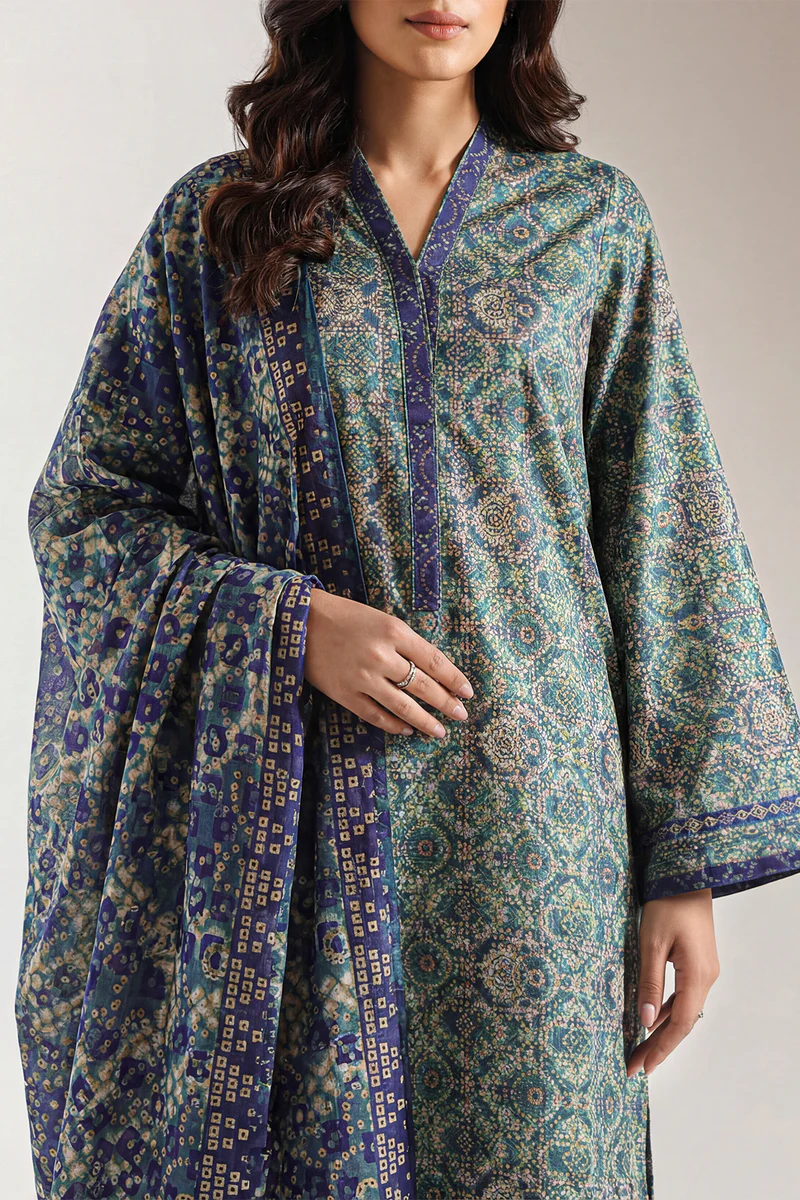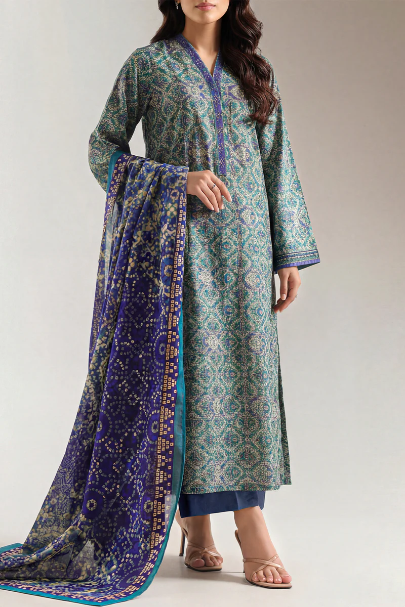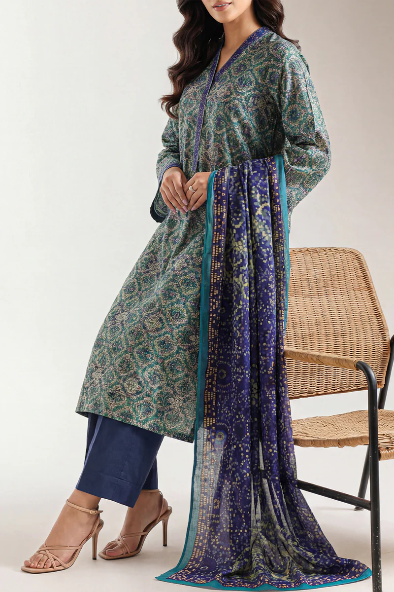 SAYA Unstitched Printed Lawn 3-Piece set features breathable lawn fabric with bright, expressive prints that add lively style to your custom outfits. This ensemble includes unstitched panels for the shirt, a matching dupatta, and a coordinated trouser, giving you full freedom to tailor each piece to your preferred fit and look. Lightweight and easy to style, this 3-piece set brings together cheerful pattern and comfortable fabric for everyday wear and seasonal elegance.