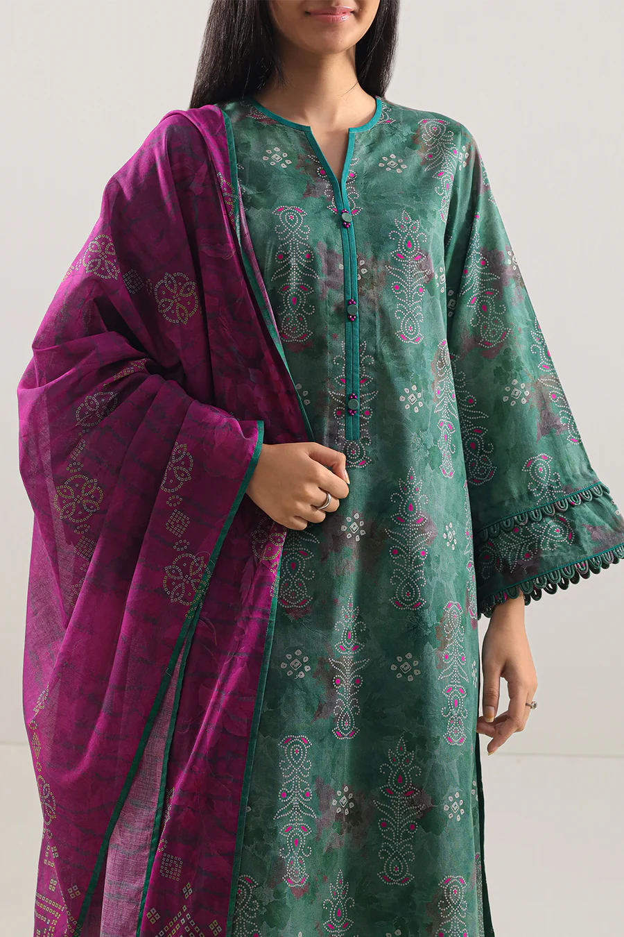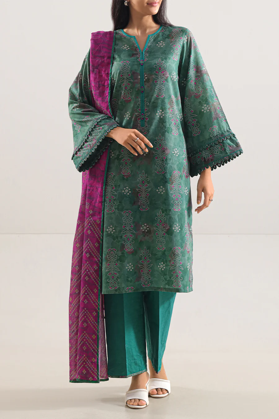 SAYA Unstitched Printed Lawn 3‑Piece set features breathable lawn fabric with lively all‑over prints that bring cheerful style to custom outfits. This ensemble includes unstitched panels for the shirt, a coordinating dupatta, and a matching trouser, giving you full freedom to tailor each piece to your preferred fit and design. Lightweight and versatile, this set blends expressive prints with comfortable fabric for effortless everyday wear and seasonal charm.